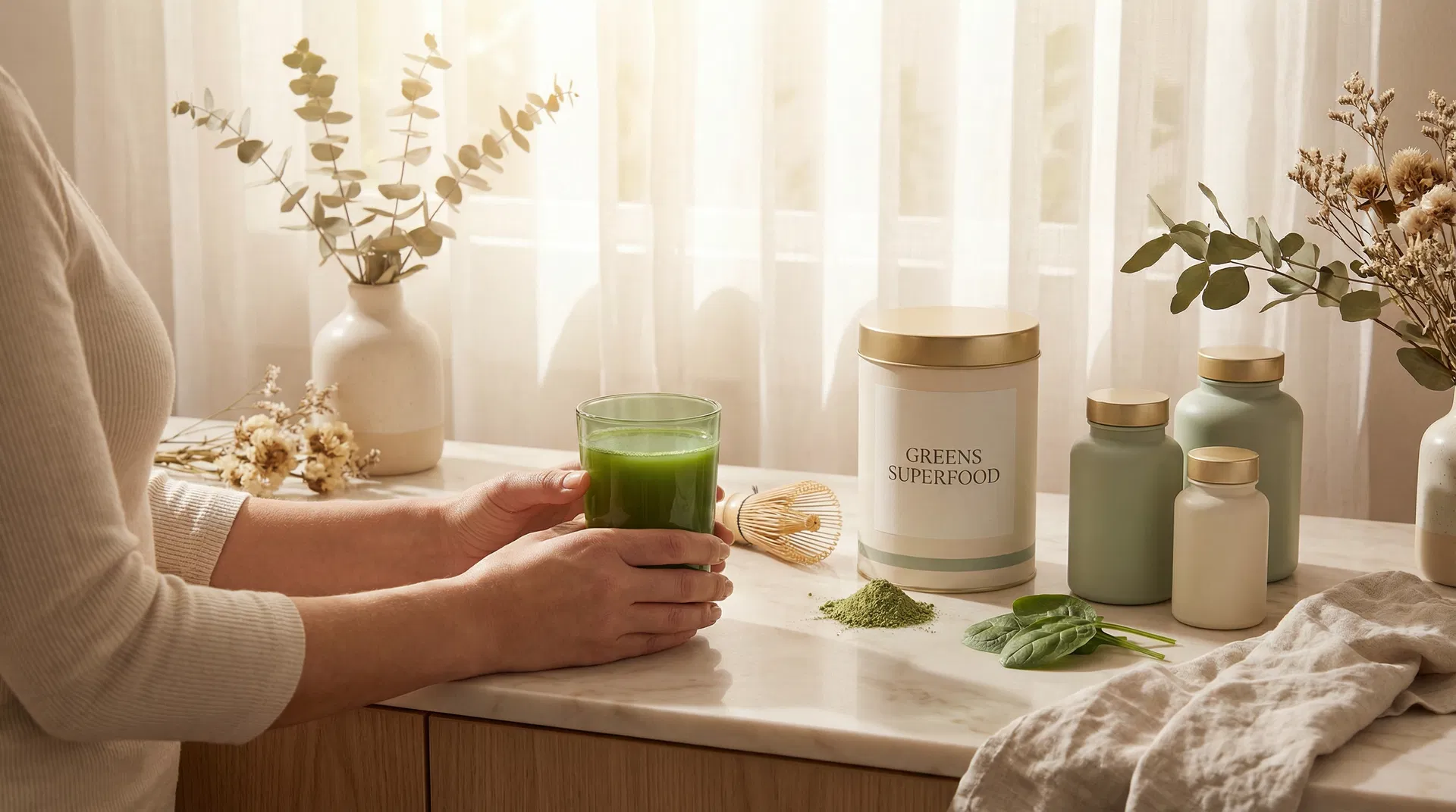 30+ organic superfoods including spirulina, chlorella, and wheatgrass